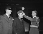 The Southwestern Exhibition and Fat Stock Show is getting a head start on publicity for the 1940 show with a Goodwill Tour. Left to right are George Putman, Clyde Jones, and J. W. Rhodes. They are engaging in a bit of cap switching as J. W., drummer in the Texas Wesleyan College band, is putting his cap on Mr. Jones and thus admitting him to the band fraternity for the trip. Mr. Putman, is wearing a three piece suit and his conductor's cap. In addition to his new band hat, Mr. Jones is dressed in a double breasted suit. J. W. is wearing his band uniform. The train is at a stop behind the men.