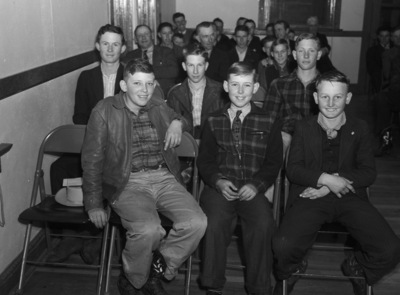 Mills County boys in Fort Worth. Six boys is foreground of top picture, left to right, front row, Harold D. Roberson, Goldthwaite; Bobbie Breen, Mullin; Beryl L. Robertson, Goldthwaite. Back row, Kenneth Geeslin, Goldthwaite; Elmer Geeslin, Goldthwaite; Leroy Hopper, Comanche.