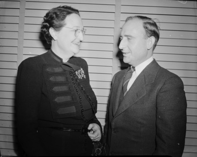 Attendees at the Texas-Oklahoma Canvas Goods Manufacturers Association meeting held at the Westbrook Hotel. Left to right are Miss Olyve Gray of Fort Worth, Texas, secretary-treasurer, and R. L. Young of San Antonio, Texas, vice president of the association. Miss Gray was in charge of local arrangements for the convention. They are standing next to each other carrying a conversation. Miss Gray is wearing a dress, coat and eyeglasses. Mr. Young is wearing a suit. Published in the Fort Worth Star-Telegram morning edition, January 29, 1940.