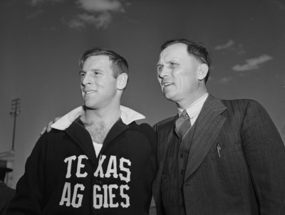 Left to right, Joe Thomason and Coach Doyle Rollins of the Texas Aggies at Southwestern Exhibition and Fat Stock Show Track Meet.