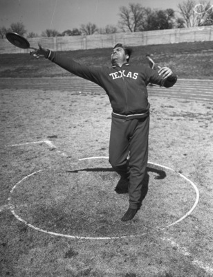 The photograph shows Jack Hughes, Texas University discus thrower in action in Southwestern Exhibition and Fat Stock Show Track Meet.