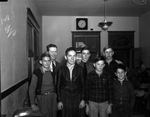 Vocational agriculture teachers and county farm agents are firmly convinced that it is just as necessary for farm boys to know selling methods as it is for them to know feeding methods. That is why visits to Fort Wort livestock market. Taylor County boys took home the biggest share s of the livestock cash. Left to right in the front row: H. S. Henderson Junior; George Plyler; Donal Crawford and Charles. Frank Parr, Back row, Assistant County Agent L. B. Higginbotham, Charles Preslar and Jean Lyles. . All are standing in a room wearing coats and blazers. There is a window and a clock in the background. There is also a hanging from the roof and a door in the background.