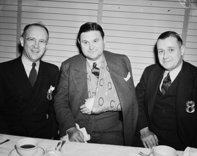 Attendees at the Texas-Oklahoma Canvas Goods Manufacturers Association annual meeting at the Westbrook Hotel. Sitting left to right are C. B. Grant of Dallas, Texas, retiring president; S. T. Jessop of Chicago, Illinois, national president, and Homer Noble of Houston, Texas, newly elected president. They are wearing suits. Mr. Grant and Mr. Noble have a number "8" pinned to their coats. Mr. Jessop's left arm is in a cast and sling. Published in the Fort Worth Star-Telegram morning edition, January 29, 1940.