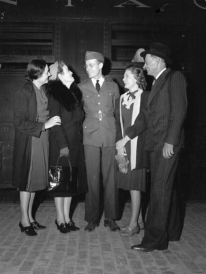Camp Bowie soldiers visited Fort Worth, Texas, on March 1, 1941. Private John George Hampton, center, was greeted by his family and girlfriend upon his arrival at the Santa Fe Railroad Station. Standing left to right are Mrs. L. Flinn, Mrs. K. Hampton (Private Hampton's mother), Private Hampton, Miss Louise Flinn, nurse at Harris Memorial Hospital, and K. Hampton (Private Hampton's father). Mrs. Flinn, Mrs. Hampton and Miss Flinn are wearing dresses and coats. Mrs. Hampton and Miss Flinn are carrying handbags. Private Hampton is wearing his military uniform and eyeglasses. Mr. Hampton is wearing a pinstripe suit and a hat.