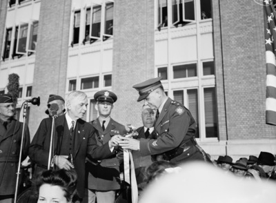 Hair, W. W. (Mayor); Krueger, Walter (Maj. Gen.); Stewart, Ed S.; Key, William S. (Maj. Gen.); Camp Barkeley; Military; Military uniforms; Military personnel; Ceremonies; Stages; Microphones; Buildings; Downtown Abilene