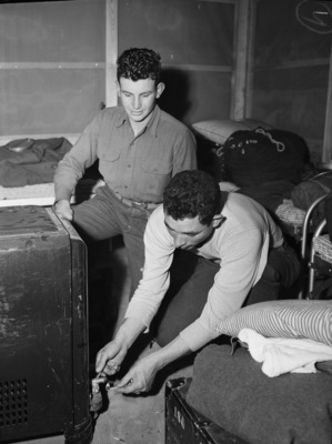 Camp Barkeley is the new military training facility near Abilene, Texas. The camp is opening their doors for the first time. Left to right are Private First Class James Allen and Sergeant Ben Paris. Both men are with Company C 180th Infantry and originally from Chilocco Indian School at Chilocco, Oklahoma. They are turning on the gas stove to warm up the barracks. Private Allen is wearing a button-up shirt and jeans. Sergeant Paris is dressed in a long-sleeve shirt and trousers. Bunks and bags are in the background.