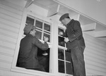 Troops from the 45th Infantry Division are arriving at Camp Barkeley, the new training facility near Abilene, Texas. Military trucks carried the division 230-miles from Fort Sill, Oklahoma. After moving in on Friday, the division went to work on Saturday. Washing windows at the mess hall, left to right, are Private E. C. Baldin and Private F. R. Utzman. The men are members of the Company M. 179th Infantry. Private Baldin is sitting on the edge of the window and leaning out to wash the top portion. He is wearing a cap, coat, and jeans. Private Utzman is standing outside the window. He is dressed in a side cap, coat, and jeans.