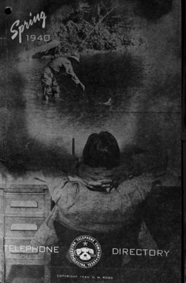 Cover of the Spring 1940 telephone directory for Electra, Texas. D. M. Robb is the vice president and general manager of the Electra Telephone Company. He sees no reason why telephone directories should not be ornamental as well as useful. The covers are created with photographs taken by Mr. Robb. This spring 1940 cover shows a man sitting in a chair and a scene above him of a man fishing. Published in The Fort Worth Star-Telegram morning edition, March 4, 1940.