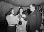 Star-Telegram Spring Auto Show, contest winners. Betty Bynum Webb, left, first prize winner, and Jean Wilson, second prize winner, receiving awards from J. M. North Junior, editor of Star-Telegram.