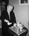 "Show me somebody else who can get cream out of a rooster," challenges Mrs. E. Stivers, as she demonstrates on of her collection of 94 pitchers which she started a year ago when she was only 78 years old. She celebrated her seventy-ninth birthday Tuesday and the gift problem was no problem. In the image, Mrs. Stivers is wearing a dress with a brooch. She is pouring a drink out of her rooster-shaped pitchers. In front of her is the table is a variety of tableware including pitchers, jugs and cups. Behind her is the shelf full of glassware such as more cups and pitchers. There is a picture-frame in the background.
