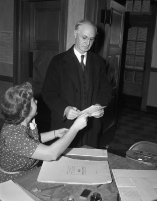 Dean Colby D. Hall of Texas Christian University, receiving ballot from Mrs. J. L. Whitman.