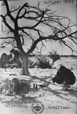 Image shows a cover of the 1939 autumn telephone directory for Electra, Texas. D. M. Robb is the vice president and general manager of the Electra Telephone Company. He sees no reason why telephone directories should not be ornamental as well as useful. The covers are created with photographs taken by Mr. Robb. This autumn cover shows one unidentified man, making a camp next to a tree. Published in The Fort Worth Star-Telegram morning edition, March 4, 1941.
