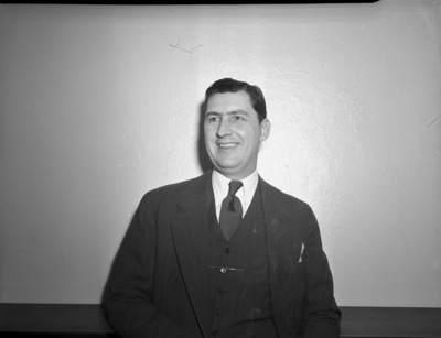 Charles W. Brock Junior is the new chairman of the entertainment committee for the Panther City Philatelic Society. He is planning a new type quiz program for the meeting at the Blackstone Hotel. Mr. Brock has collected stamps for 23 years and specializes in German, Mexican, and Chinese stamps. He is standing against a wall, dressed in a three piece suit.