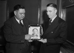 A bullet-Pierced Picture of the defendant, which was one of the exhibits in the trial of Mrs. Lila Mae Lenck of Olten, Texas, is examined by Sheriff Hutson of Lamb County, left, and District Attorney Martin, who prosecuted the case. Mrs. Lenck was given a five-year suspended term Thursday for the fatal shooting of her son-in-law in Littlefield, Texas, last year. In the image, both men are standing in a room holding the proof of crime. Both men are wearing suits.