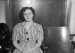 This is Miss Norene Allen Clark of Harlingen, Texas, a witness in the Lenck trial whom the defense brought all the way from the Rio Grande Valley, Texas, to testify. In the image, Clark is wearing a striped dress and sports a short hair. There is fur and empty chair on the either side of her.