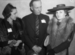 There were smiles on most of the faces when West Texans gathered for the annual Spring meeting of the directors of the Texas Sheep and Goat Raisers Association at Sweetwater, Texas. Left to right are Mrs. Boyd Clayton, Mr. and Mrs. Clay Adams, all of Ozana, Texas. All three are standing in front of a wall. Mrs. Clayton and Mrs. Clayton are wearing fur. Mrs Clayton is wearing a veil and Mrs. Clay Adams is wearing a hat. Mr. Clay Adams is wearing a suit.