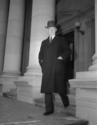 Reverend L. D. Anderson, pastor of the First Christian Church, standing on the steps of First Christian Church in an overcoat. He will be honored, March 9 in celebration of the start of his thirtieth year as pastor. Published in the Fort Worth Star-Telegram evening edition, March 8, 1941.