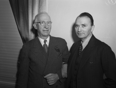 John E. Farrell, left, honored Sir Louis Beale, a member of the British Purchasing Commission in the United States, with a luncheon during his Fort Worth visit. They are standing arm in arm.