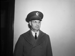 First Lieutenant F. G. Macomber, of Eugene, Oregon, is the public relations officer for the Invantry Replacement Center at Camp Wolters. The former teacher at the University of Oregon, was called into active duty from his reserve post. His department in the replacement center will receive the first of 18,000 selections next week. Lieutenant Macomber is standing against a wall wearing his military uniform and a coat.