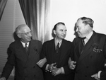 Host and knighted guest. Left to right, John E. Farrell, Sir Louis Beale, and A. A. Lund standing arm in arm. Farrell honored Sir Louis Beale, a member of the British Purchasing Commission in the United States, with a luncheon during his Fort Worth visit. Sir Louis Beale is holding a cigar. Published in the Fort Worth Star-Telegram morning edition, March 8, 1941.