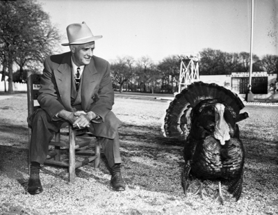 Edward J. Flynn, of New York, seated on a chair on the grounds of Shady Oak Farm, next to a large turkey during the Flynn party.