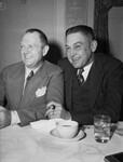 Charles J. Belden, left, rancher at Pitchfork, Wyoming, and James M. Brook, of Brady, Texas, were among the attendees at the annual business meeting and banquet of the Texas Hereford Association. Brook was re-elected as president of the association at the conclusion of the meeting. The two men are sitting at a dinner table, both smiling. Mr. Belden is wearing a pinstripe suit and Mr. Brook is wearing a dark, three-piece suit. Mr. Brook is also holding a cigar in his left hand.