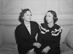 The Auxiliary to the Tarrant County Medical Society is electing new officers. Sitting on a striped couch left to right are Mrs. C. O. Terrell and Mrs. Joseph F. McVeigh. Mrs. Terrell is the incoming president of the auxiliary. She is dressed in a blouse, blazer, and a skirt. Mrs. McVeigh is the retiring president. She is wearing a button-up dress with ruffles around the collar.