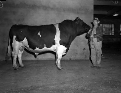 Grand champion Holsteins at the Southwestern Exposition and Fat Stock Show. "Sir Hazel Piebe," grand champion bull, belonging to H. B. Hales and Sons of Amarillo, Texas. H. B. Hales, owner is at the halter.