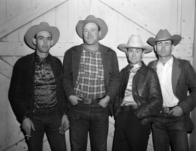 Cowboys. Left to right, Vic Schwarz of Wichita Falls, bronco rider; Gene Ross of Sayre, Oklahoma, bulldogger; Hoyt Hefner of Wichita Falls, bareback bronco rider; and Clyde Burke, Comanche, Oklahoma, calf roper at the Southwestern Exposition and Fat Stock Show.