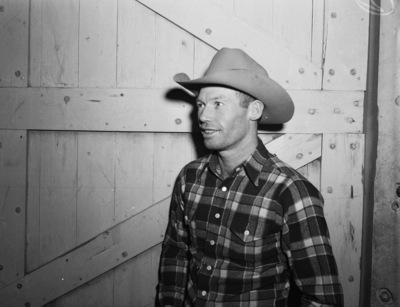 Paul Bond of Carlsbad, New Mexico, bull rider at the Southwestern Exposition and Fat Stock Show. Paul Bond is shown wearing a plaid cowboy flannel along with his cowboy hat.