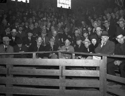 Sale of champions at the Southwestern Exposition and Fat Stock Show. Shot of some of the buyers and part of the huge crowd of spectators at the sale of champions. Some of the buyers and part of the huge crowd of interested spectators at the auction sale are shown.
