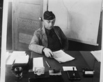 Major Paul Brewer is the Construction Quartermaster at Camp Wolters, one of the Nation's largest Army replacement centers. He is shown sitting at his desk, looking over a stack of documents. Major Brewer is wearing a side cap and his military uniform. There is a map hanging on the wall behind him. Published in Fort Worth Star-Telegram.