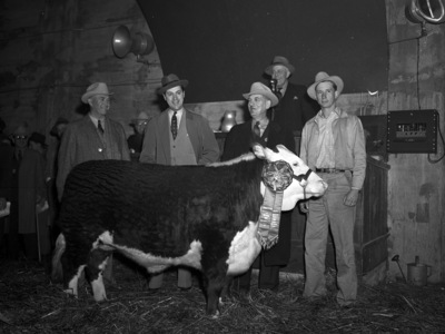 John C. Burns, president of Stock Show; Harry W. Chesley, Chicago, Illinois, national sales promotion manager of Pabst Brewing Company; D. W. Williams of Texas A. & M.; and Terrill Stewart, feeder, shown with grand champion steer at the Southwestern Exposition and Fat Stock Show. Chesley bid in on this steer at $2 a pound.