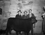 Reserve grand champion steer, fitted out by Fred Brown of Winters, right, and Henry Love, left, Wallace Martin, center, Vocational teacher at Winters at the Southwestern Exposition and Fat Stock Show, Sale of Champions. Henry bid in at 75 cents a pound. Wallace Martin coached Brown.