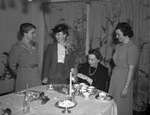 Kappa Alpha Theta Sorority. Alumnae tea. Mrs. R. E. Hardwicke, left, Mrs. Donald B. Sinclair of Toronto, Canada; Mrs. A. B. Greene, pouring tea; and Mrs. Roy J. Loveless Junior.