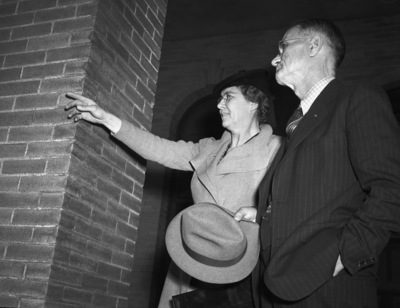 Reverend (right), and Mrs. T. J. Furness of Vernon, Texas, alumnae of Southwestern Baptist Theological Seminary. They are surveying the campus and commenting on the many changes since they enrolled as students twenty-five years earlier. They are standing on the steps of Fort Worth Hall. Mrs. Furness is wearing a hat and coat. Reverend Furness is dressed in a three piece, pinstripe suit. He is holding his hat. Published in The Fort Worth Star-Telegram Morning Edition January 30, 1940.