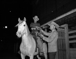 Horses at the Southwestern Exposition and Fat Stock Show. Grady Blue of Gordon, on "Snooks," winner of the cutting horse contest. He is receiving award from Don Nesbitt, who has a cigarette in his mouth. Blue and Snooks won a similar contest last Summer at the Texas Cowboy Reunion at Stamford. Blue is foreman of the Cantey Ranch in Palo Pinto County.
