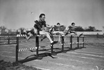 Southwestern Exhibition and Fat Stock Show Track Meet. Boyce Gatewood of University of Texas, (far right), clearing the second hurdle in the one hundred-twenty yard dash. Pete Owens, (nearest camera) of Howard Payne finished second.