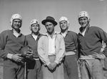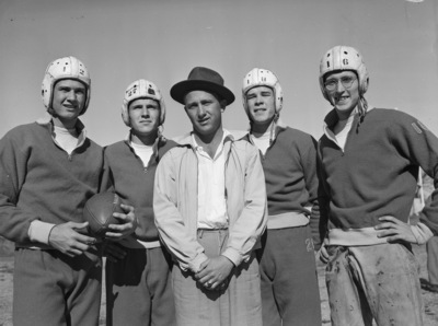 Southwestern Exhibition and Fat Stock Show Track Meet. Members of the winning high school football relay team from Arlington Heights High School are (left to right) Joe Dines, Harrel Oliver, Coach Johnny Stovall, Charley Dewees and Don Frye.