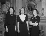 New Junior League officers left to right are, Mrs. Jon Knox Rhodes, Mrs. W. R. Watt and Mrs. C. E. Hyde. Mrs. Rhodes is the corresponding secretary. She is wearing a dark colored blazer and skirt. Mrs. Watt is the recording secretary. She is wearing a dress with a wide, frilly collar. Mrs. Hyde, treasurer, is wearing a dress with flowers and lace along the front. The women are standing in front of a fireplace. There is a round mirror hanging about the mantle.