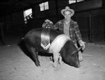 Champion livestock at the Southwestern Exposition and Fat Stock Show. Grand Champion barrow exhibited by Vernon Edwards, Rotan, Texas. Grand Champion barrow was sold to Globe Laboratories at $2.30 a pound.