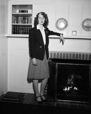 Image shows Miss Jeanne Hancock standing beside fireplace, daughter of Mrs. John Hancock 4062 Modlin Street. Published in the Fort Worth Star-Telegram morning edition March 23, 1941.