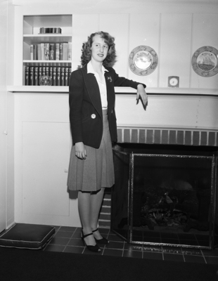 Image shows Miss Jeanne Hancock standing beside fireplace, daughter of Mrs. John Hancock 4062 Modlin Street. Published in the Fort Worth Star-Telegram morning edition March 23, 1941.