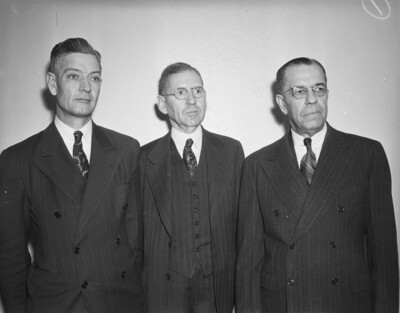 Officers of the Business Men's Bible Class of Broadway Baptist Church include, left to right, J. L. Parvin (stewardship vice president), Reverend L. R. Elliott (course instructor) and H. B. Ruch (president). Reverend Elliot is also a librarian at the Southwestern Baptist Theological Seminary. The three men are standing in front of a wall. Mr. Parvin is wearing a double-breasted pinstripe suit. Reverend Elliot is wearing a three-piece pinstripe suit and eyeglasses. Mr. Ruch is wearing a double-breasted pinstripe suit and eyeglasses.