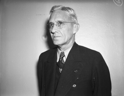 C. W. Armstrong is the fellowship vice president of the Business Men's Bible Class of Broadway Baptist Church. Mr. Armstrong is shown standing in front of a wall, wearing a suit and a pair of eyeglasses.