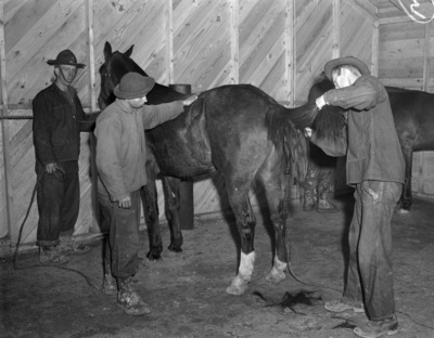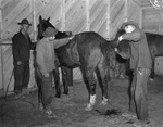 113th Cavalry at Camp Bowie, Brownwood, Texas; troops use electric clippers to shear horse's tail.