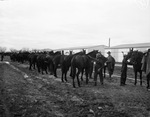 113th Cavalry at Camp Bowie, Brownwood, Texas; horses are tied to picket line near the barn for daily grooming.