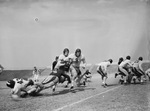Texas Christian University (T. C. U.) Spring football trainees Jim Pritchett, number five, tackeling N. C. Hall. Derrell Palmer, number forty-three.