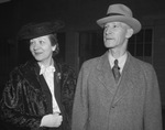 Brigadier General William Hood Simpson is being transferred to Camp Wolters in Mineral Wells, Texas where he will serve as commanding officer of the camp. He is traveling to the camp with his wife Mrs. William H. Simpson. Mrs. Simpson is wearing a hat, button-up blouse, blazer, skirt, coat, and gloves. General Simpson is dressed in a hat, suit, and a coat. Published in Fort Worth Star-Telegram, evening edition, March 22, 1941.