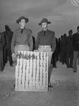 A crowd is gathering in Mineral Wells, Texas at Camp Wolters. The giant Infantry Replacement Center is officially being turned over from the construction quartermaster to the Army. The camp commander, Colonel Fay Brabson, left, is receiving symbols of the 6,000 keys to buildings on the reservation from Major Paul Brewer, Constructing Quartermaster. Both men are dressed in military uniforms. Published in Fort Worth Star-Telegram, morning edition, March 23, 1941.
